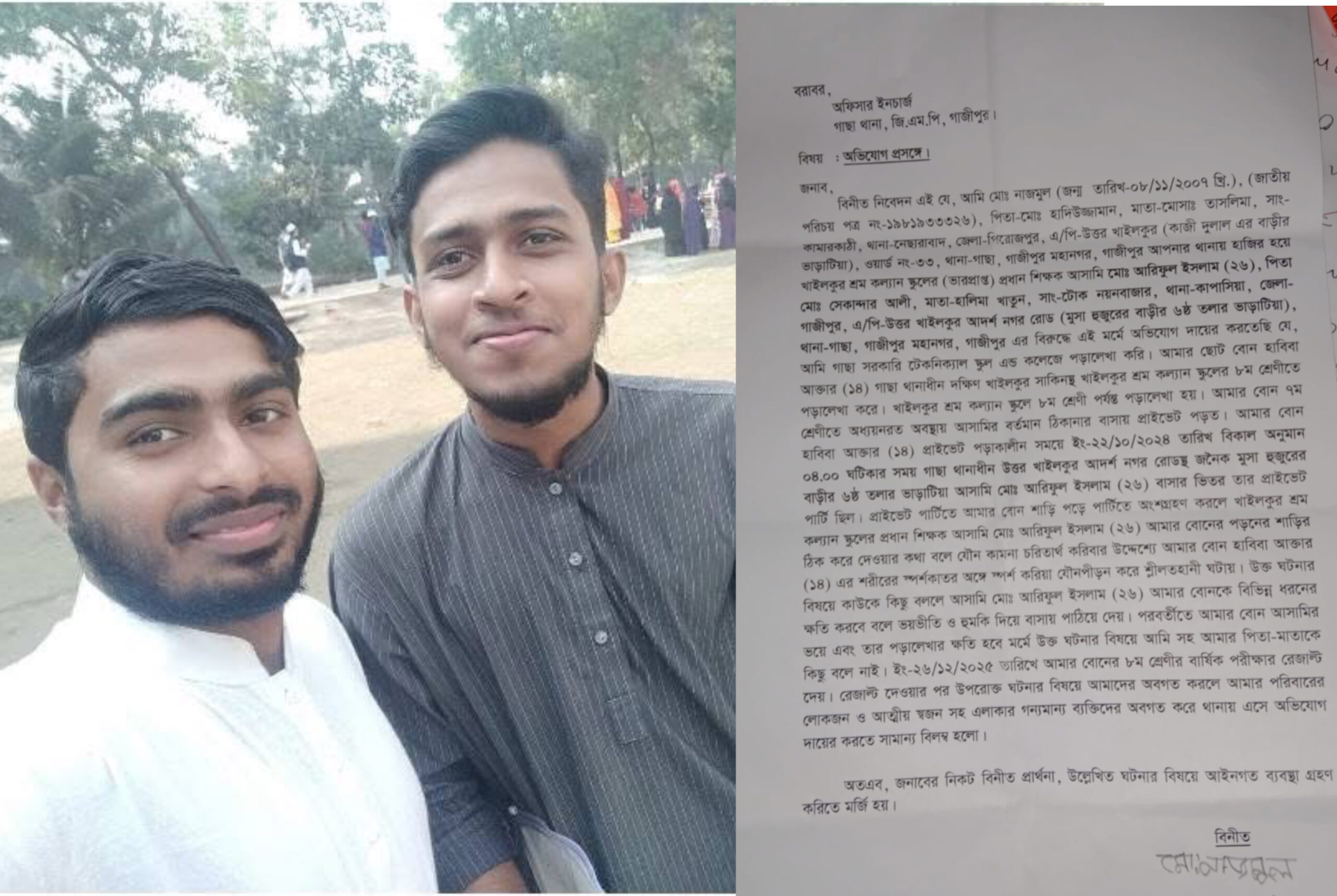 গাজীপুরে শ্রম কল্যাণ স্কুলের ভারপ্রাপ্ত প্রধান শিক্ষকের বিরুদ্ধে যৌন হয়রানির অভিযোগে শিক্ষার্থীদের বিক্ষোভ গাজীপুরের খাইলকুরে শ্রম কল্যাণ স্কুলের ভারপ্রাপ্ত প্রধান শিক্ষক আরিফের বিরুদ্ধে ছাত্রীদের যৌন হয়রানির অভিযোগ ওঠায় শিক্ষার্থী ও অভিভাবকরা বিক্ষোভ করেছেন। শুক্রবার সকাল ১০টার দিকে স্কুলে পরীক্ষার ফল প্রকাশ অনুষ্ঠানের সময় এ ঘটনা ঘটে। প্রত্যক্ষদর্শীরা জানান, ফল প্রকাশ অনুষ্ঠানের মধ্যে শিক্ষার্থীদের অভিভাবক ও স্থানীয় কয়েকজন স্কুল প্রাঙ্গণে প্রবেশ করলে পরিস্থিতি উত্তেজনাকর হয়ে ওঠে। এরপর শিক্ষার্থী ও অভিভাবকদের একটি অংশ প্রধান শিক্ষক আরিফের বিরুদ্ধে অভিযোগ তুলে বিক্ষোভ শুরু করেন। অভিভাবকদের অভিযোগ, আরিফ বিভিন্ন সময়ে ছাত্রীদের নানা উপায়ে যৌন হয়রানি করতেন এবং অসামাজিক কার্যকলাপে জড়াতে চাপ দিতেন। ঘটনায় অন্তত চারজন শিক্ষার্থী সরাসরি যৌন হয়রানির অভিযোগ করেছে বলে জানা গেছে। অভিযোগকারীরা আরও জানান, তার অনৈতিক কার্যকলাপের বিরুদ্ধে কেউ প্রতিবাদ করলে তিনি শুধুমাত্র শিক্ষার্থী বা অভিভাবক নন — স্কুলের অন্যান্য শিক্ষকদেরও বিভিন্ন ধরনের হুমকি দিতেন এবং চাকরি হারানোর ভয় দেখাতেন। এ ছাড়া অভিযোগ রয়েছে, তার প্রস্তাবে রাজি না হলে পরীক্ষায় ফেল করিয়ে দেওয়া, স্কুল থেকে বহিষ্কার এবং রাজনৈতিক পরিচয়ের আড়ালে মামলার ভয় দেখানো হতো। বিক্ষোভে অংশ নেওয়া কয়েকজন শিক্ষার্থীরাও প্রধান শিক্ষকের বিরুদ্ধে অনৈতিক আচরণ ও ভয়ভীতির অভিযোগ তুলে তার পদত্যাগের দাবি জানান। এ সময় তারা বিভিন্ন স্লোগান দেয়। জানা গেছে, খাইলকুর শ্রম কল্যাণ স্কুলটি হান্নান গ্রুপের অর্থায়নে পরিচালিত হয়। প্রধান শিক্ষক আরিফ নিজেকে ‘বৈষম্যবিরোধী ছাত্র আন্দোলনের নেতা’ বলে পরিচয় দিলেও যাচাই করে তার সঙ্গে ওই সংগঠনের কোনো আনুষ্ঠানিক সম্পৃক্ততা পাওয়া যায়নি বলে অভিযোগ করা হয়েছে। ঘটনার খবর পেয়ে গাছা থানা পুলিশ ঘটনাস্থলে গিয়ে পরিস্থিতি নিয়ন্ত্রণে আনে এবং প্রধান শিক্ষক আরিফকে পুলিশ হেফাজতে নেয়। অভিযোগের বিষয়ে পুলিশের পক্ষ থেকে এখনো আনুষ্ঠানিক বক্তব্য পাওয়া যায়নি। ঘটনাটি তদন্তাধীন রয়েছে।